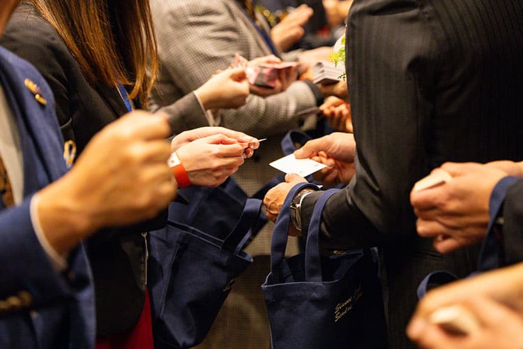 大名刺交換会があるため、最低でも80枚、会場によっては100枚以上の名刺を持参することをおすすめします。名刺には社名と役職名の記載が必須です。